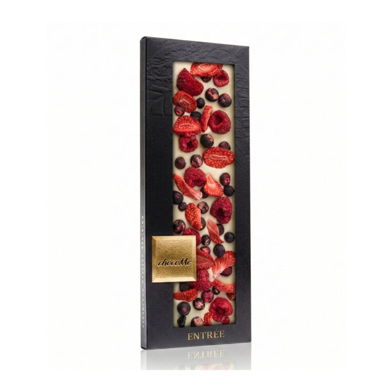 Sastav: chocoMe bijela čokolada, liofilizirane jagode, crne ribizle i liofilizirane maline- cijela